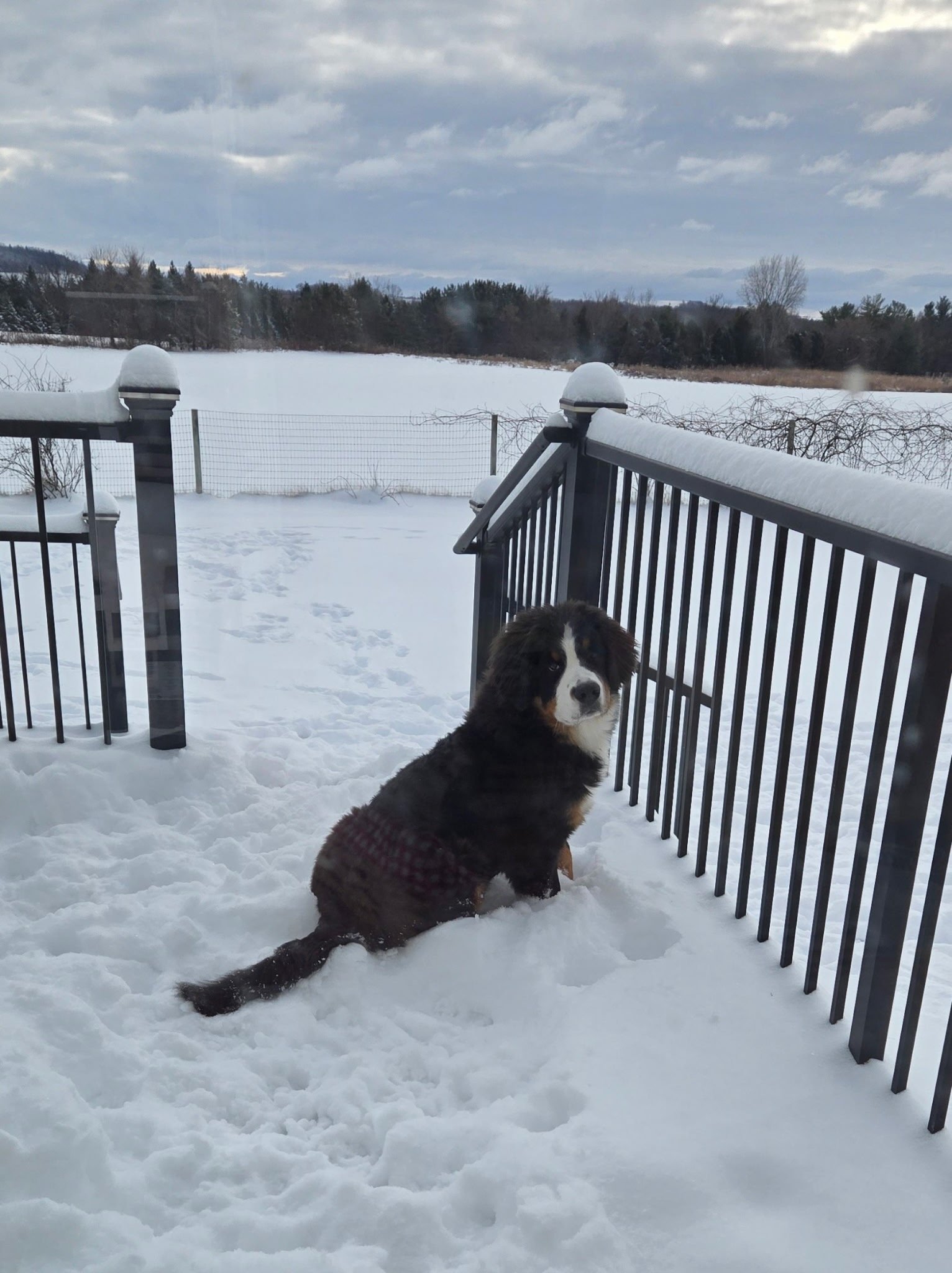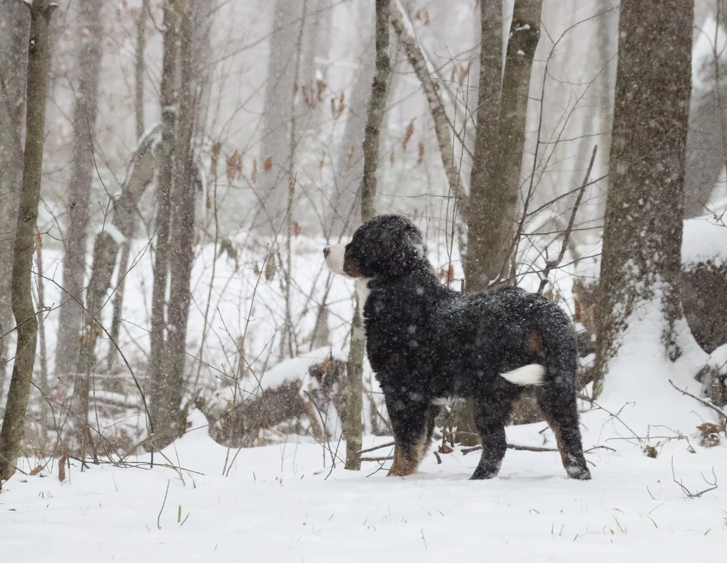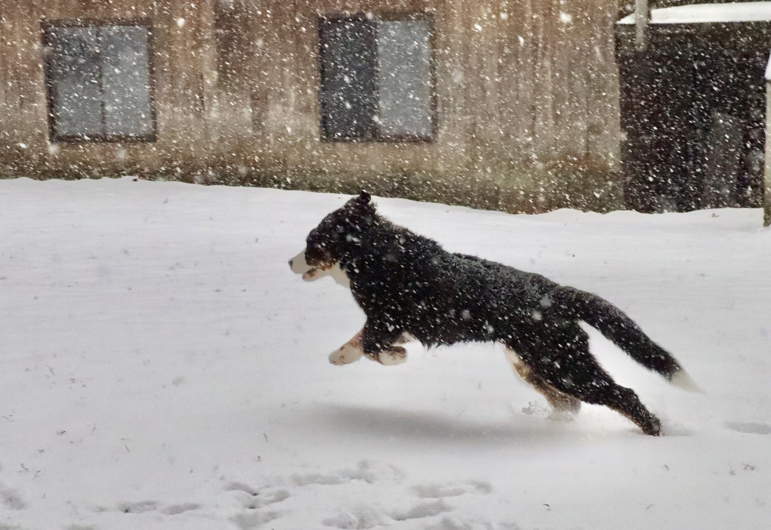 Jasper received 6+ inches of snow for a half birthday present and has reveled in burrowing, bouncing and zooming around the yard. He even pauses occasionally to survey his newly frosted domain.