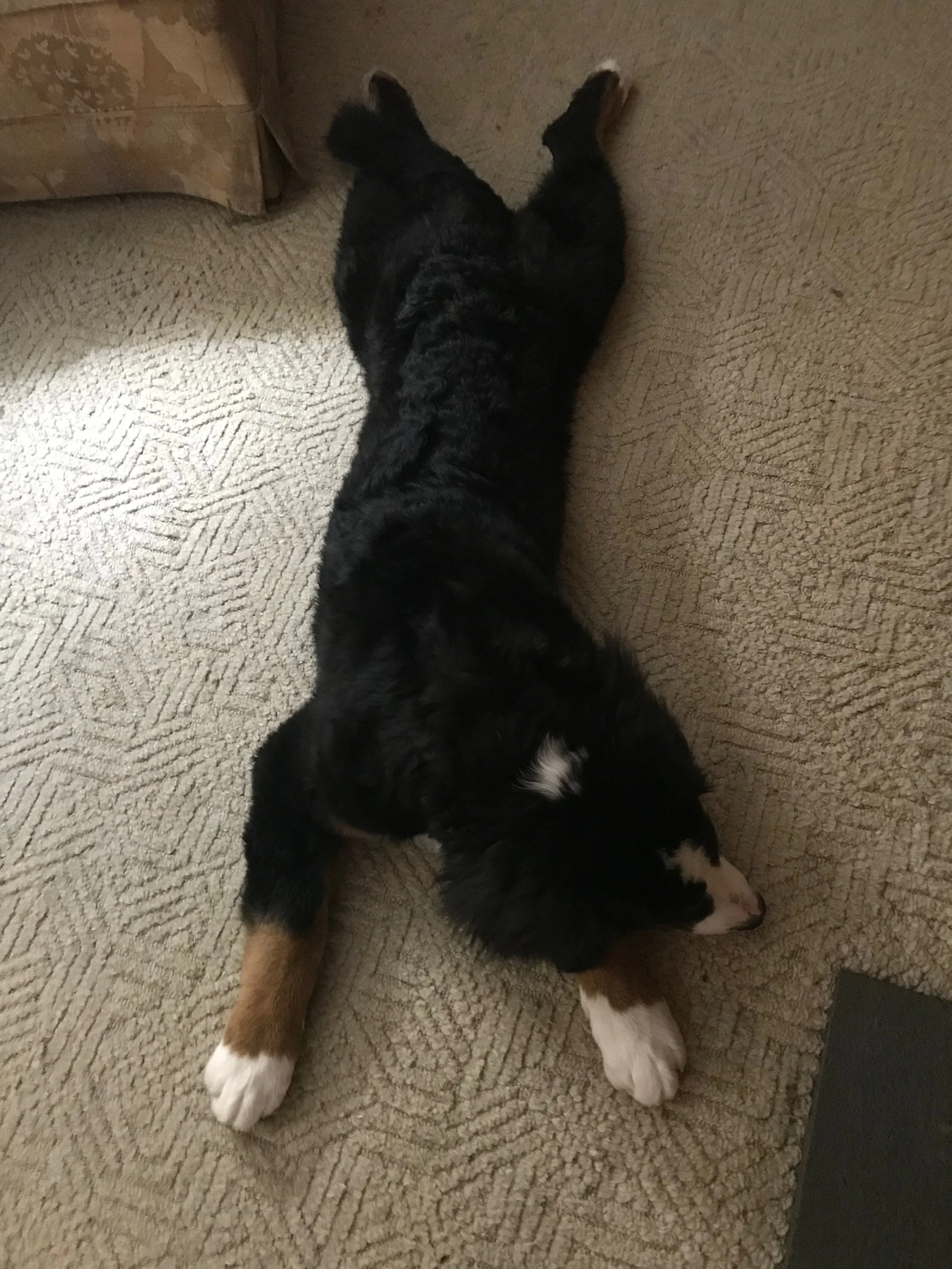 He has reached his adolescent, longer and leaner stage. When stretched out he is amazingly long and when asleep he achieves rubber puppy mode.